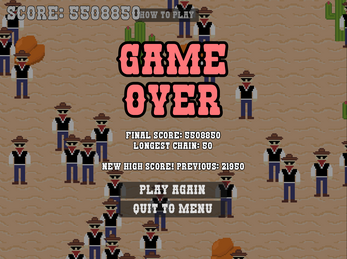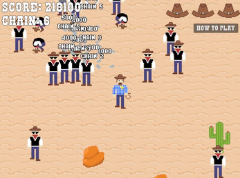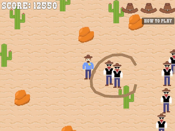 Loop 'Em Up, Cowboy! is an arcade-style shoot-em-up set in the old west. Grab enemies with your lasso and throw them at obstacles to defeat them. See how high of a score you can get!